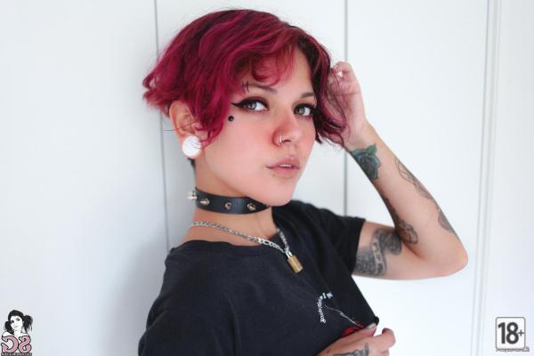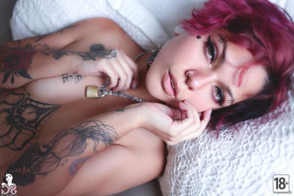 Молодая неформалка, оставшись одна дома, лежит в кровати и снимает кружевное белье, обнажая свое худенькое тело, полностью покрытое татуировками. Она смущенно прикрывает свои маленькие груди руками и призывно смотрит в камеру своими красивыми глазами.
